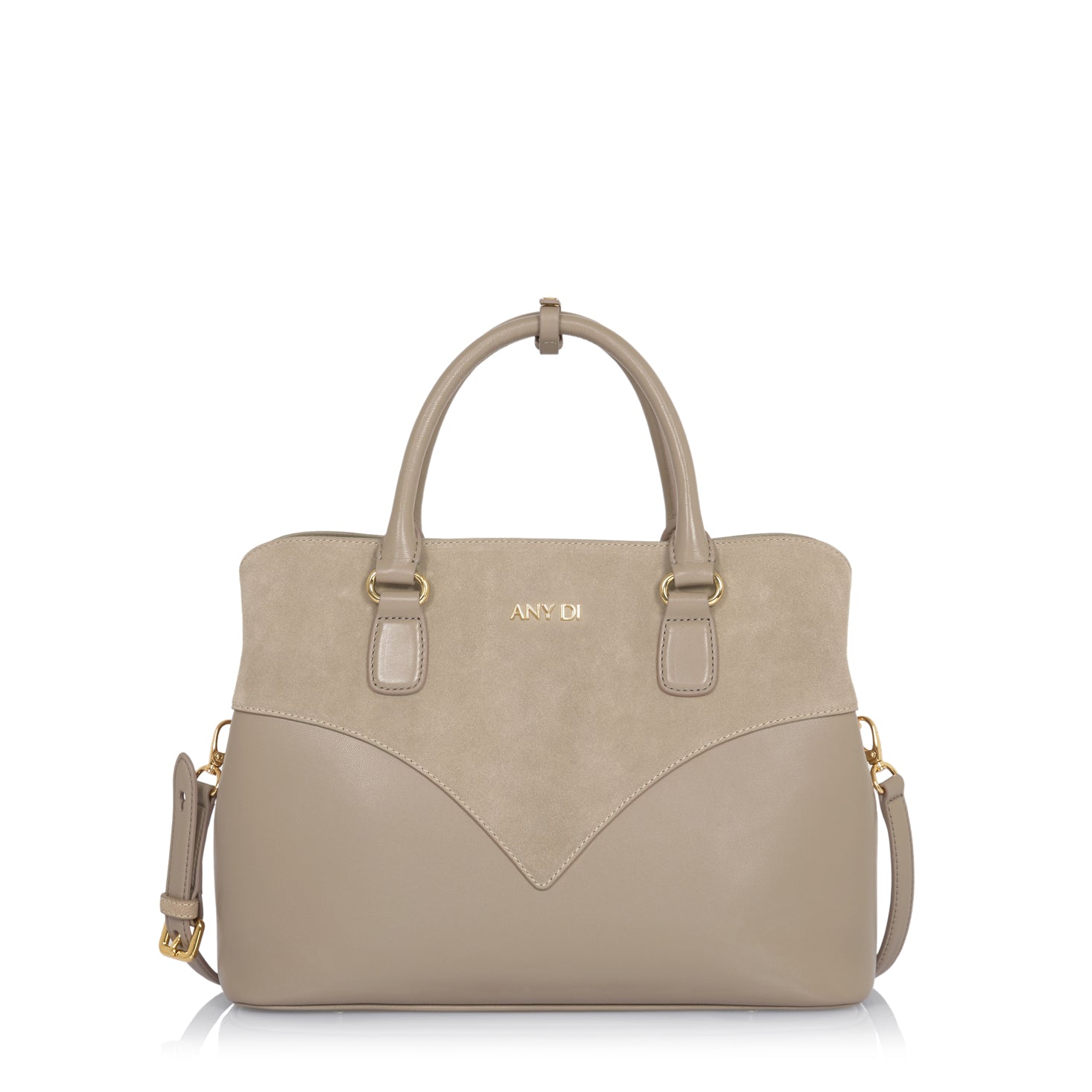 Das geschmeidige Rindsleder und die erstklassige Verarbeitung schaffen das optimale Gleichgewicht zwischen purem Luxus und Alltagstauglichkeit. Die hochwertigen Echt-Gold plattierten Metallelemente sorgen für einen außergewöhnlich luxuriösen Look. Der Mix aus Nappa und Suede Leder prägt das neue Design der Bag M. Durch die verschiedenen Materialien wird das ANY DI Emblem hervorgehoben. Die Tasche in Farbe Taupe ist klassisch und zugleich sehr stylisch.