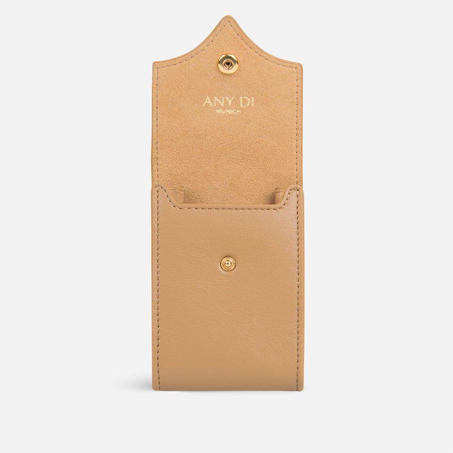 The Mini Pocket Camel combines a warm tone with functional design. Made from high-quality vegan leather and suede, it offers space for small essentials and features a refined texture.