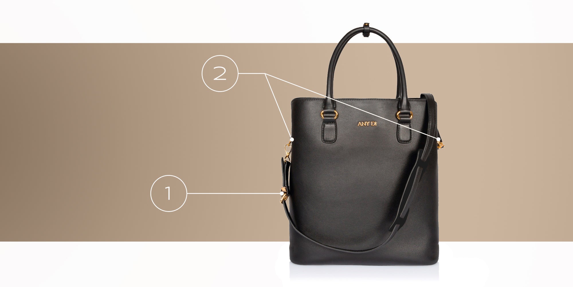 Das DESIGN-PATENTIERTE Bag-Strap-System bietet unbegrenzte Tragemöglichkeiten und hervorragende Flexibilität ohne sichtbare Konstruktion. Mit dieser Innovation schafft ANY DI eine Revolution auf dem globalen Modemarkt. ANY DI-Taschen können innerhalb einer Minute an Ihren individuellen Stil angepasst werden. So gelingt ihnen die Balance zwischen Mode und Multifunktionalität. Eine Tasche – mehrere Tragevarianten.
